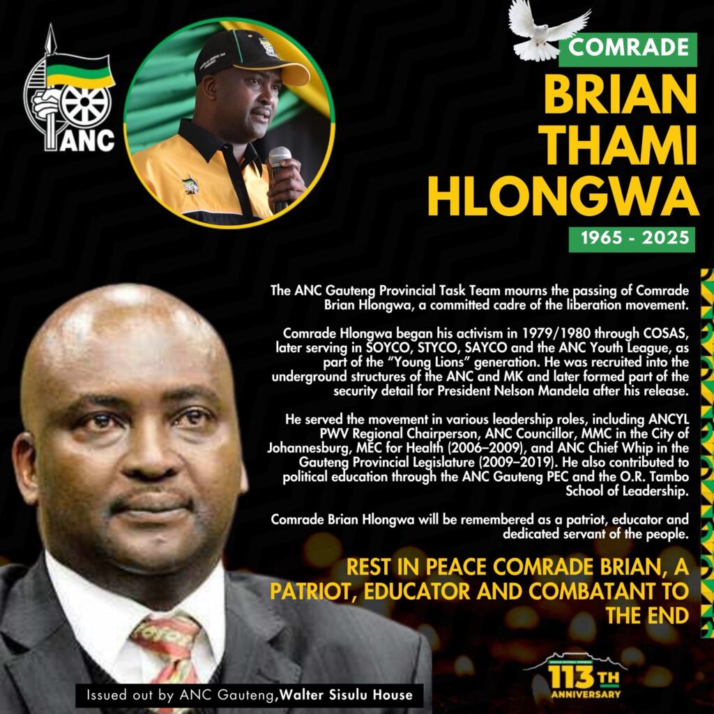 According to ANC Gauteng Brian Hlongwa, was a committed cadre of the liberation movement. Brian Hlongwa began his activism in 1979/1980 through COSAS, later serving in SOYCO, STYCO, SAYCO and the ANC Youth League, as part of the “Young Lions” generation.
